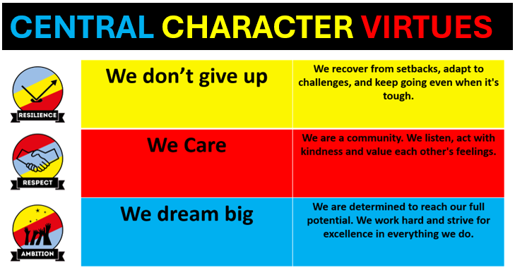This ethos perfectly aligns with our three character virtues of ; Respect, Ambition and Resilience. These three character virtues were chosen by staff, students and parents & carers as a community.